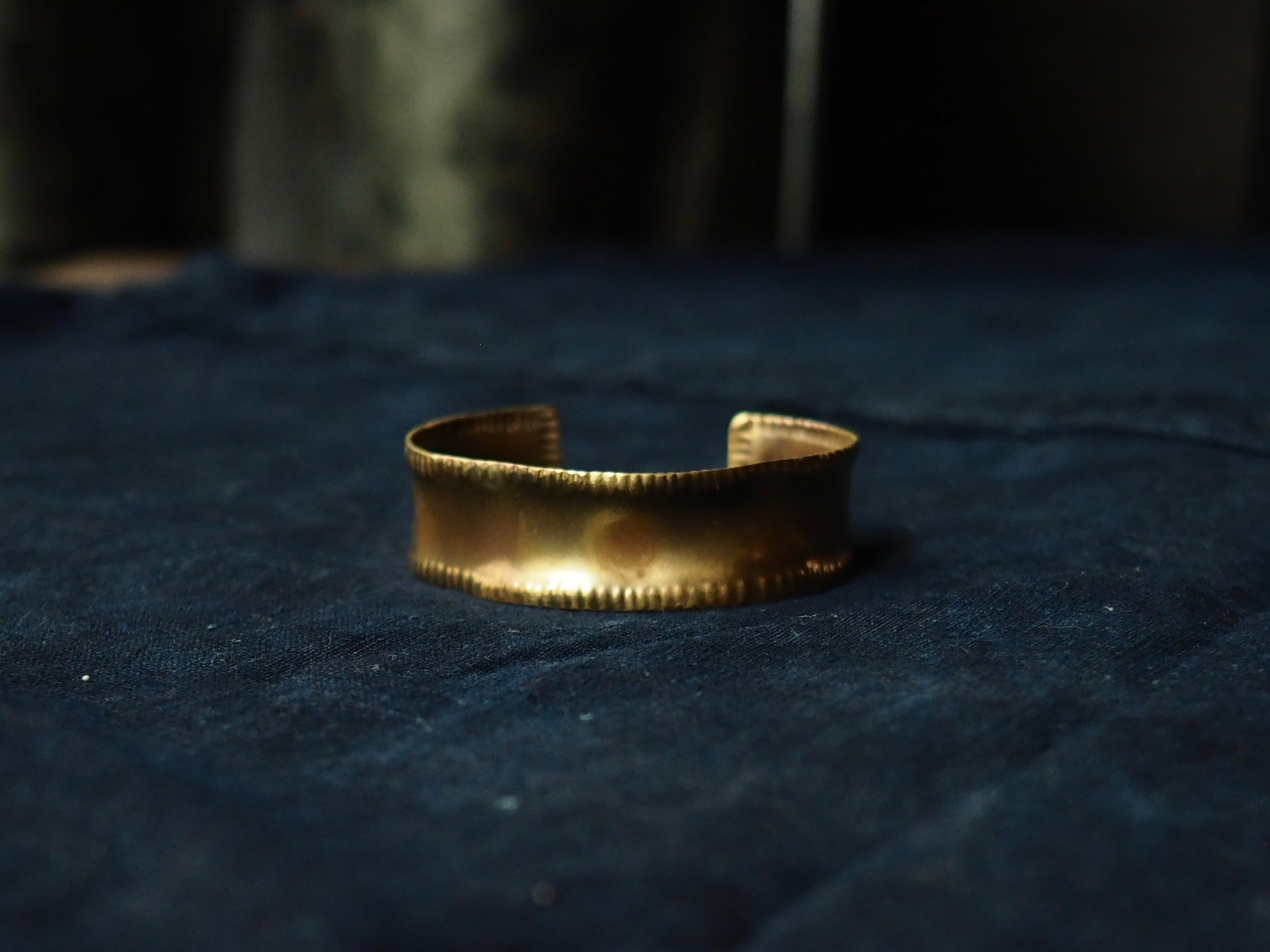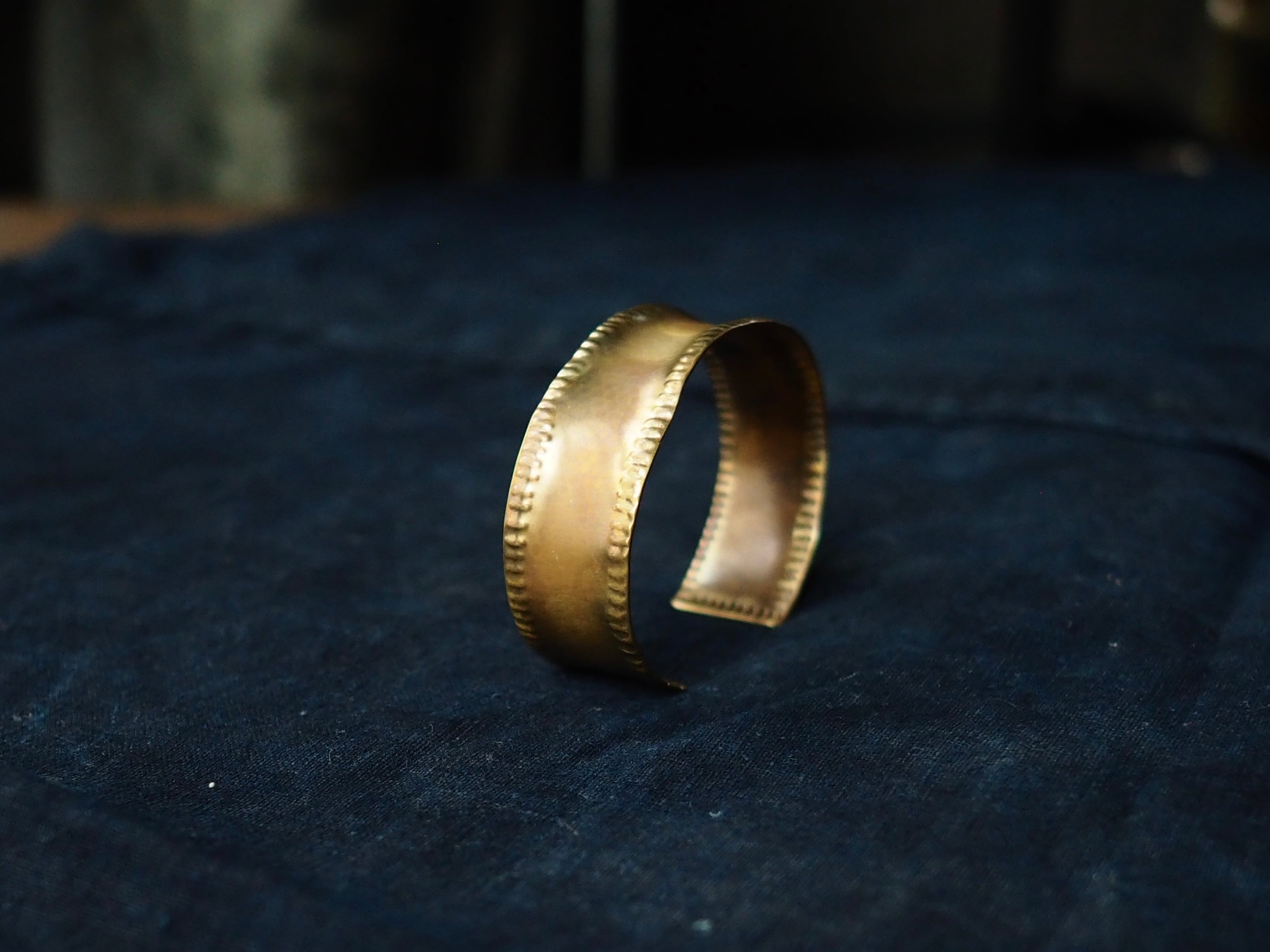 こちらは、手作業でひとつひとつ仕上げられた真鍮のバングルです。火をあてた金属の色の変化を感じられる独特の仕上げは、時間とともに味わいが増していきます。サイズ調整も可能ですが、やりすぎにはご注意ください。バングルMサイズは標準体型女性〜細身体型男性向けです。