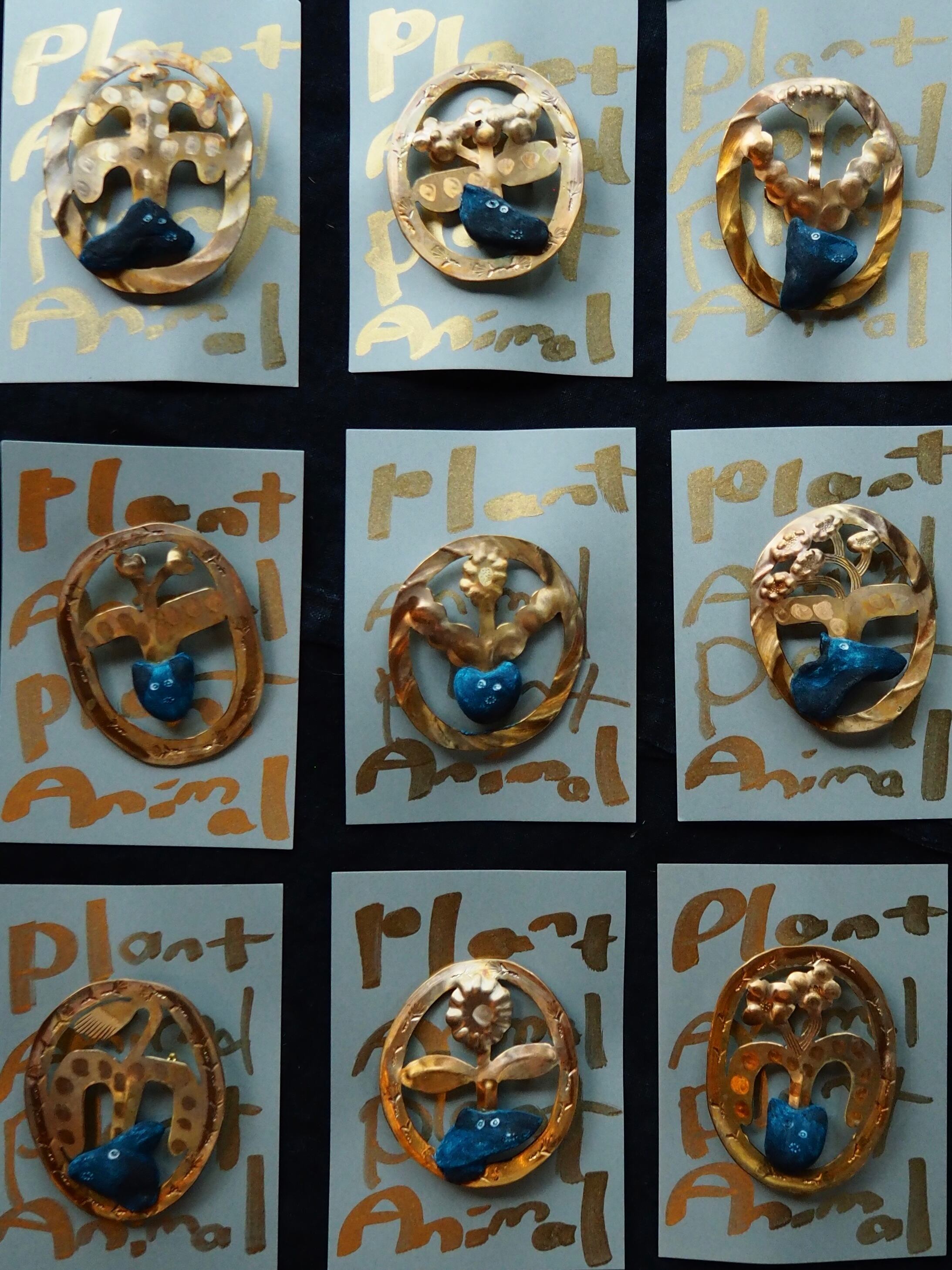 様々な青い動物たちが頭から植物を生やしており、あなたのファッションに彩りを添えてくれるブローチです。